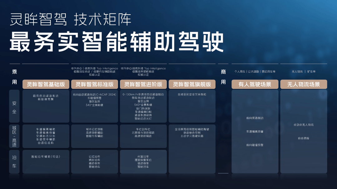 在智能驾驶方面,上汽通用五菱发布的灵眸智驾技术矩阵,以“强感知、轻地图、精算力”为技术路线,构建了覆盖城区、高速、泊车场景的四级智驾体系。从基础版到旗舰版,层层进阶,提供了从辅助驾驶到全场景智驾的全方位解决方案。上汽通用五菱还推出了行业首个商用车安全智驾方案,实现了商乘同享,进一步推动了智驾技术的普及。