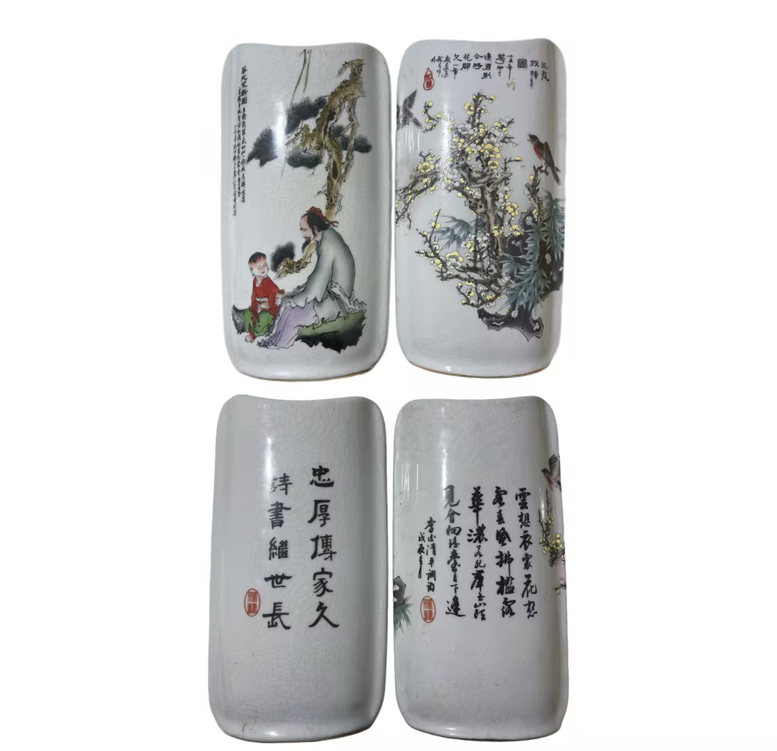 (三)“匠人的生计载体”:藏在瓷板里的“讨生活”这块瓷板也是匠人“生计的见证”:民国景德镇御窑厂解散,很多匠人靠画民窑瓷为生,双面瓷板“一块抵两块”,能卖个好价钱;开片釉的工艺虽然复杂,但批量生产后成本可控;题材选“高士+家训”,是因为这两种题材“最受欢迎”——匠人的每一个工艺选择、题材选择,都藏着“养家糊口”的现实考量。