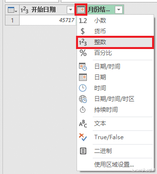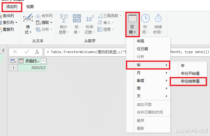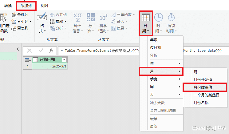 5. 选择任务栏的“添加列”-->“日期”-->“月”-->“月份结束值”
