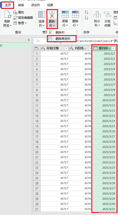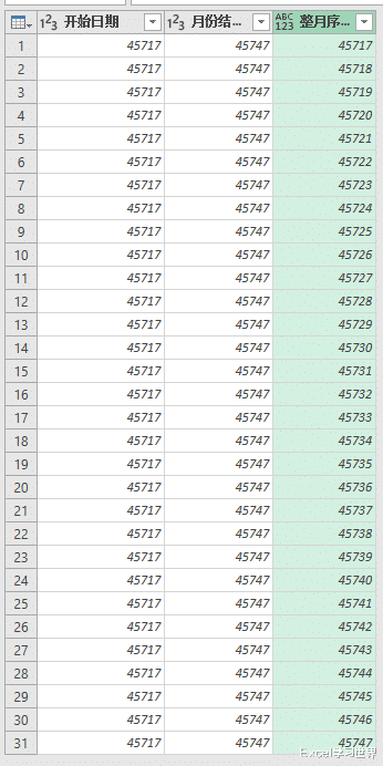 如果要得到当季度或当月第一天至年底的序列,可以分别将第 5 步修改为“添加列”-->“日期”-->“季度”-->“季度结束值”或“添加列”-->“日期”-->“年”-->“年份结束值”。