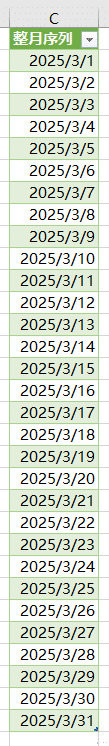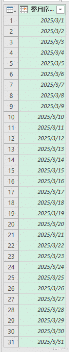 右侧绿色的表格就是 A 列日期所在月的完整日期序列。