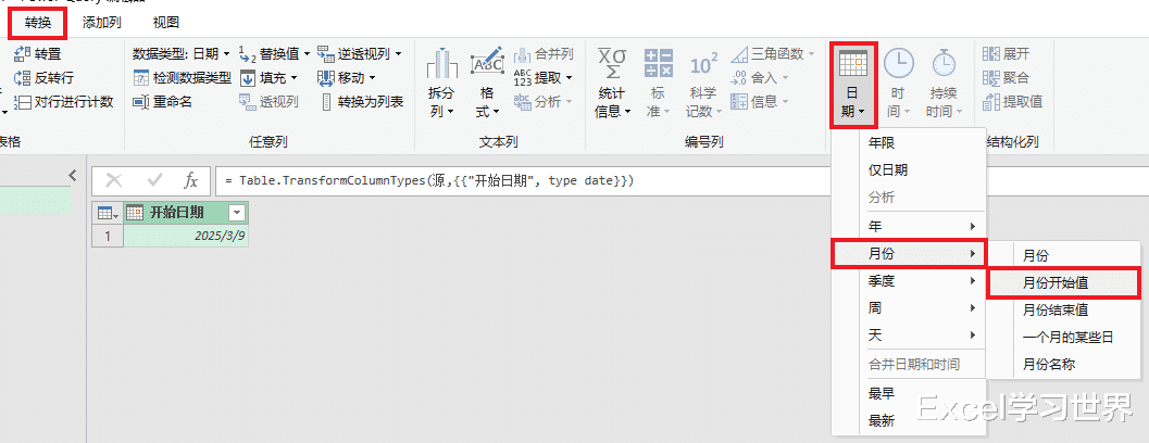 4. 选择任务栏的“转换”-->“日期”-->“月份”-->“月份开始值”