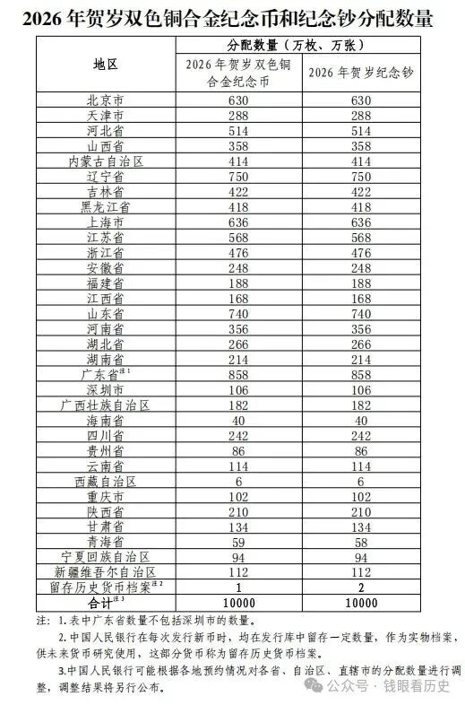 各省、自治区、直辖市双色铜合金纪念币和纪念钞分配数量如下: