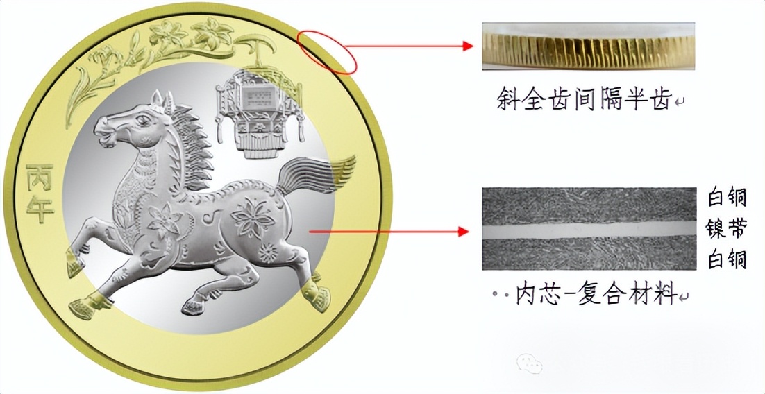 硬币外环为黄铜合金,内芯为具有独特机读性能的镍带复合白铜材料。防伪特征效果见图1。