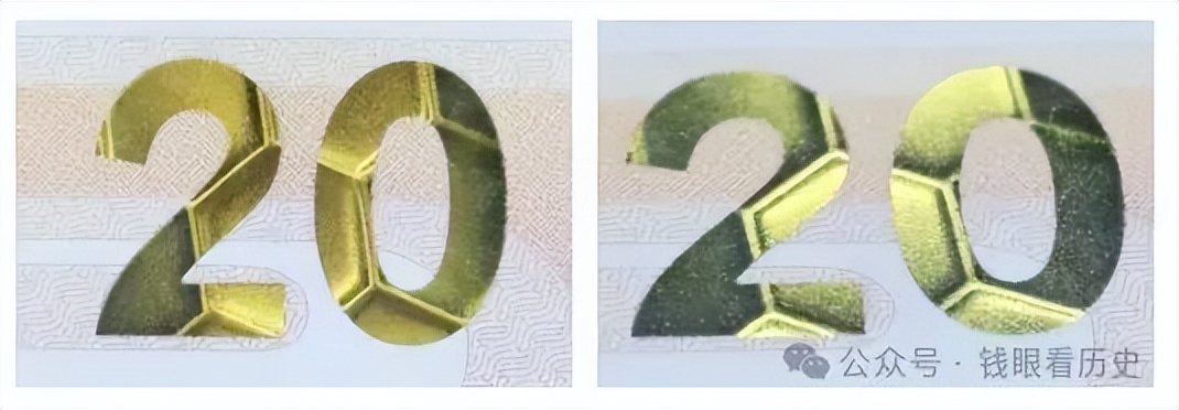 位于票面正面。改变观察角度,面额数字“20”的颜色在金色和绿色之间变化,并可见圆形光环效果。防伪特征效果见图8。