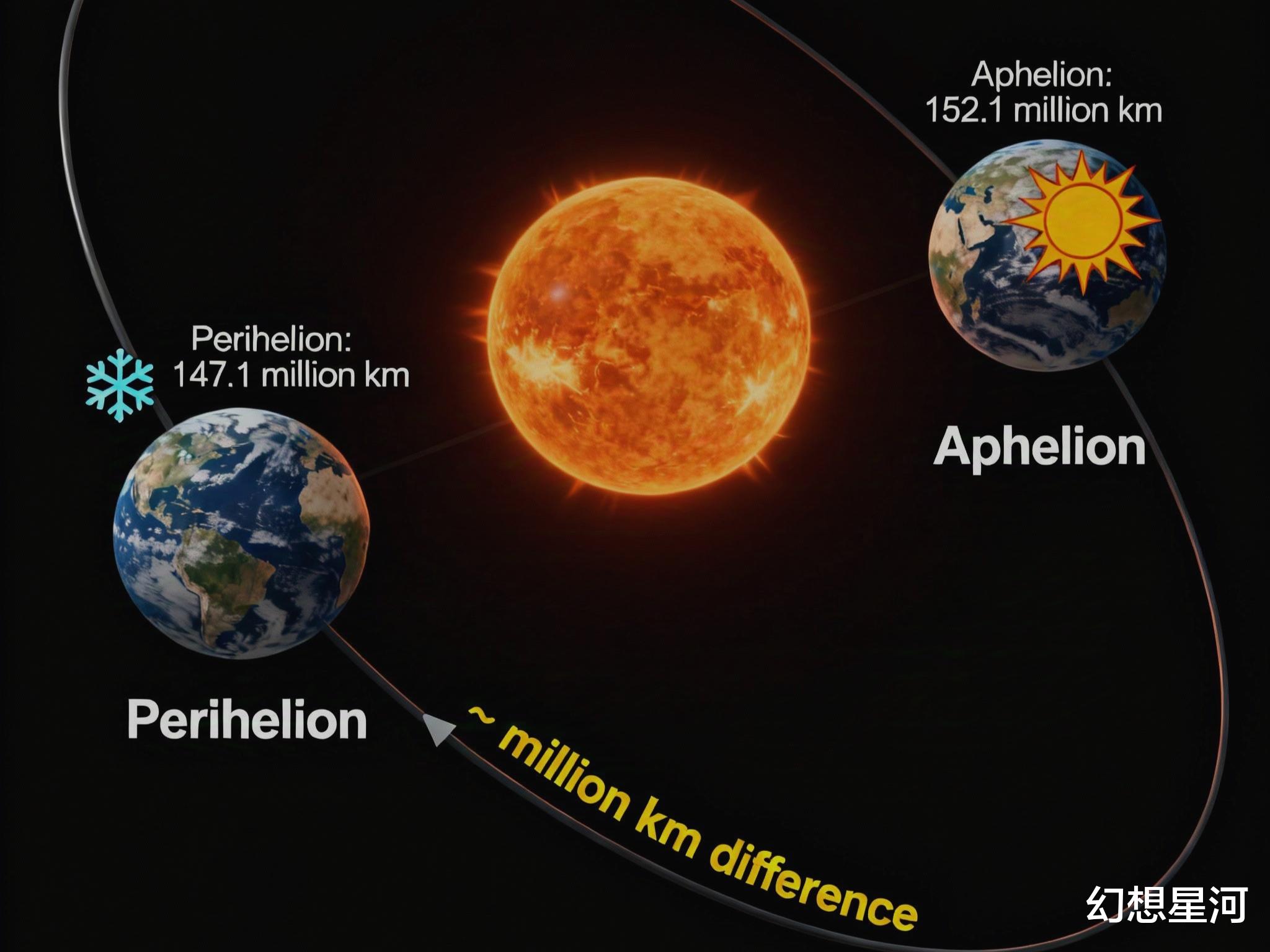 很多人直觉认为,离热源越近越热,就像烤火时凑得越近越暖和。地球和太阳的关系,远不是凑不近那么简单。500万公里的差距,是地球与太阳平均1.5亿公里距离的不到3%。小的差距带来的太阳辐射量差异只有6%左右,改变季节,6%左右的太阳辐射量差异不足以做到。咱们冬天穿厚衣服还觉得冷,夏天穿短袖都嫌热,不是这6%的辐射量能决定的。