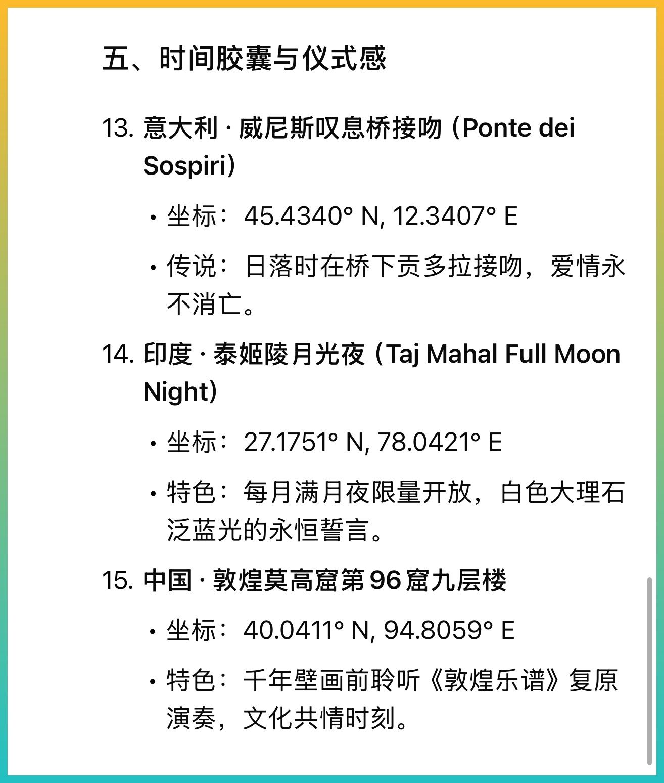 ✅ 文化共鸣:优先选彼此都向往的地标,比如文学、影视取景地,会有双倍幸福感!