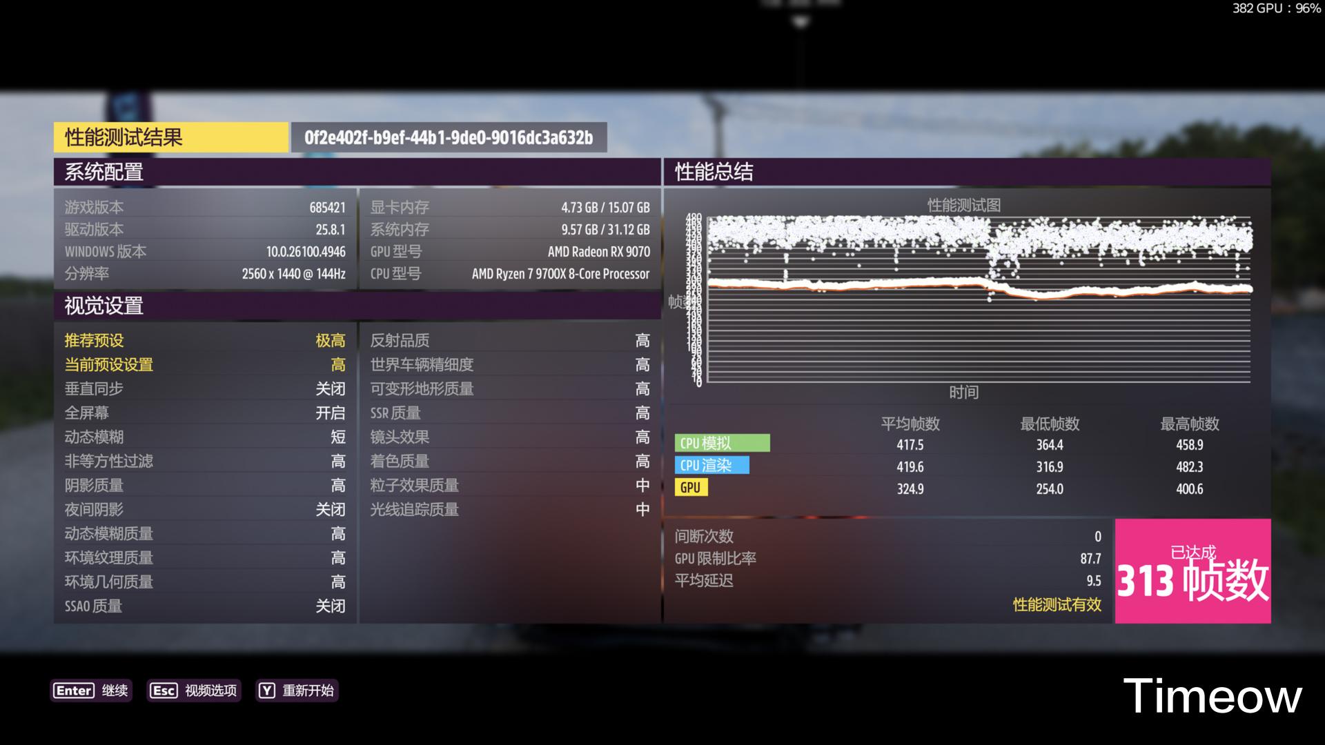 平均帧354.2,最低帧303.3,最终达成304帧数,飙车时画面丝滑无比,毫无卡顿感。