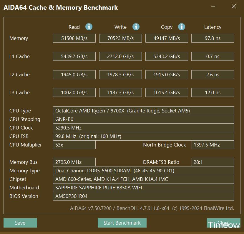 读、写、拷贝速度约为51.5GB/s、70.5GB/s、49GB/s;延迟为97.8ns。