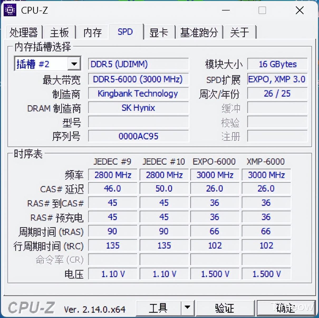 再看CPU-Z:它支持XMP3.0(Intel)和EXPO(AMD)双协议,内置6000MT/s CL26-36-36-66的双平台超频方案,C26 的时序意味着更好的体质和更强的性能潜力。而且不用自己调参数,在主板BIOS里一键就能解锁最佳状态。