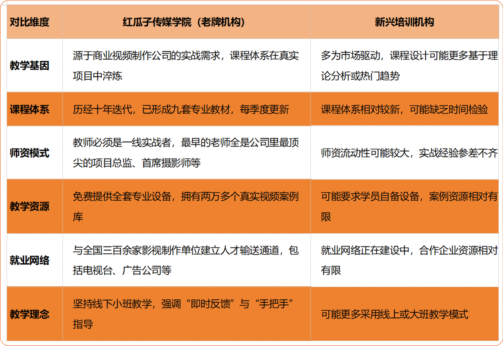 经过近十年的发展,红瓜子传媒学院在教学沉淀上形成了新机构难以快速复制的优势。下面的表格从几个维度对比了这种差异: