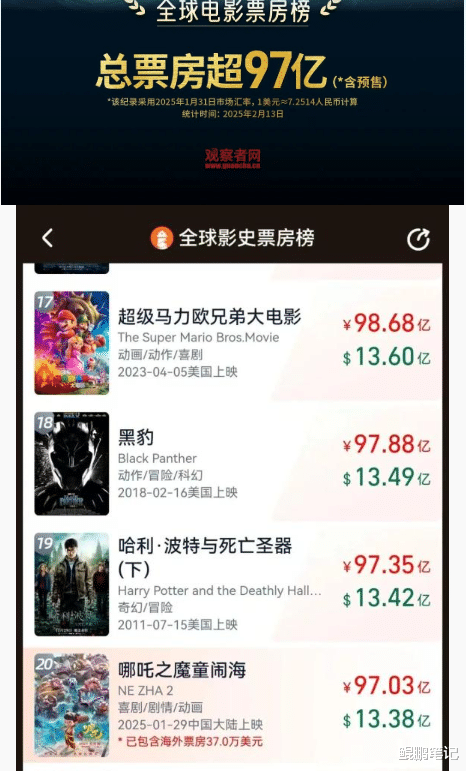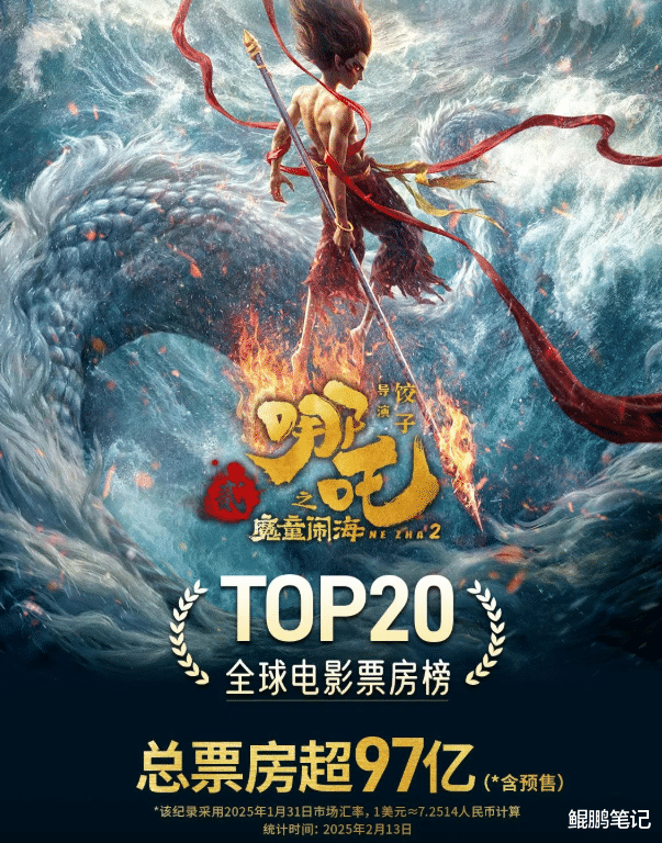 谁能想到啊朋友们,那个喊着“我命由我不由天”的小魔童,五年后直接把票房天捅了个大窟窿。97.02亿啊朋友们,什么概念?《死侍与金刚狼》都被甩在身后,亚洲电影第一次冲进全球票房前20!