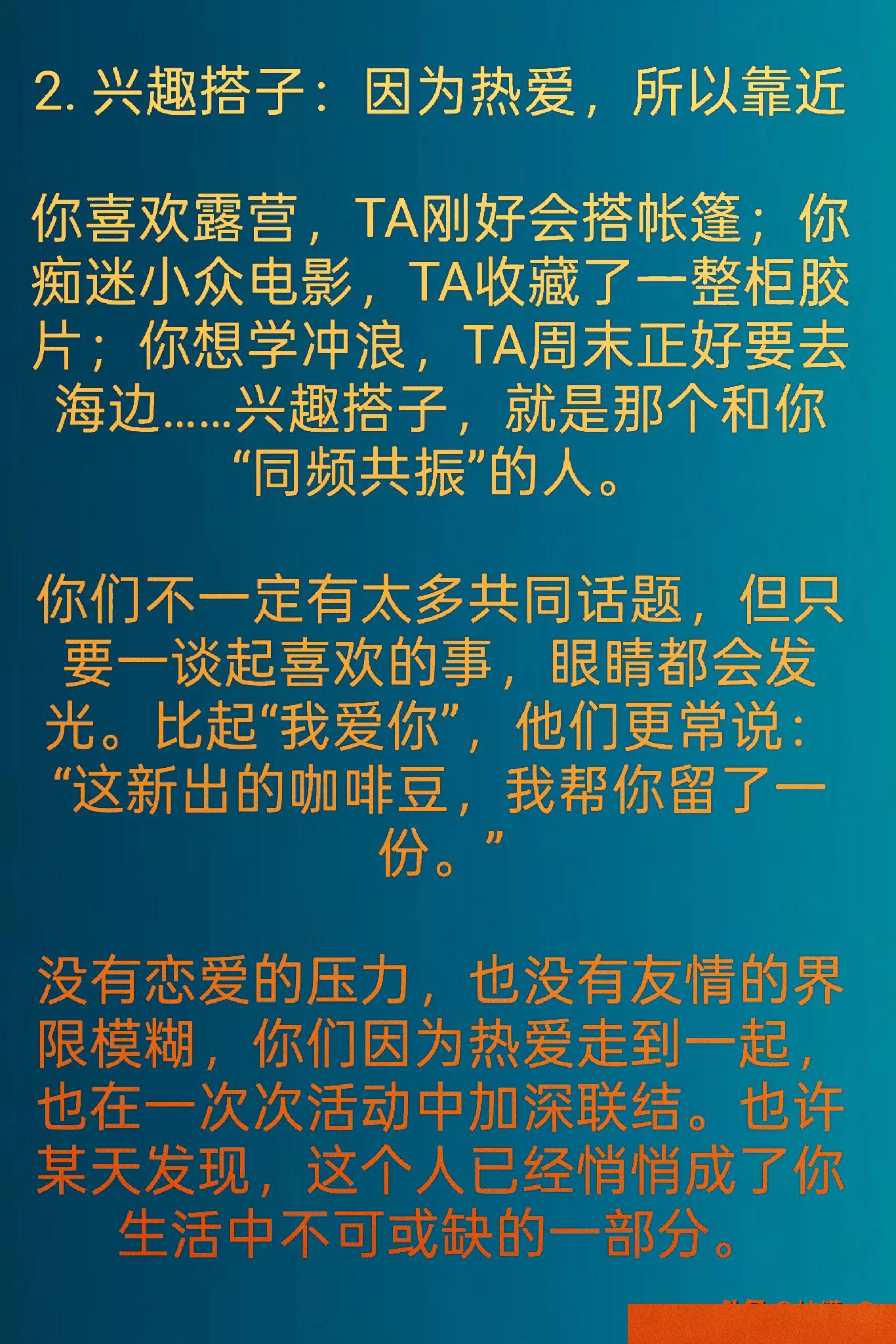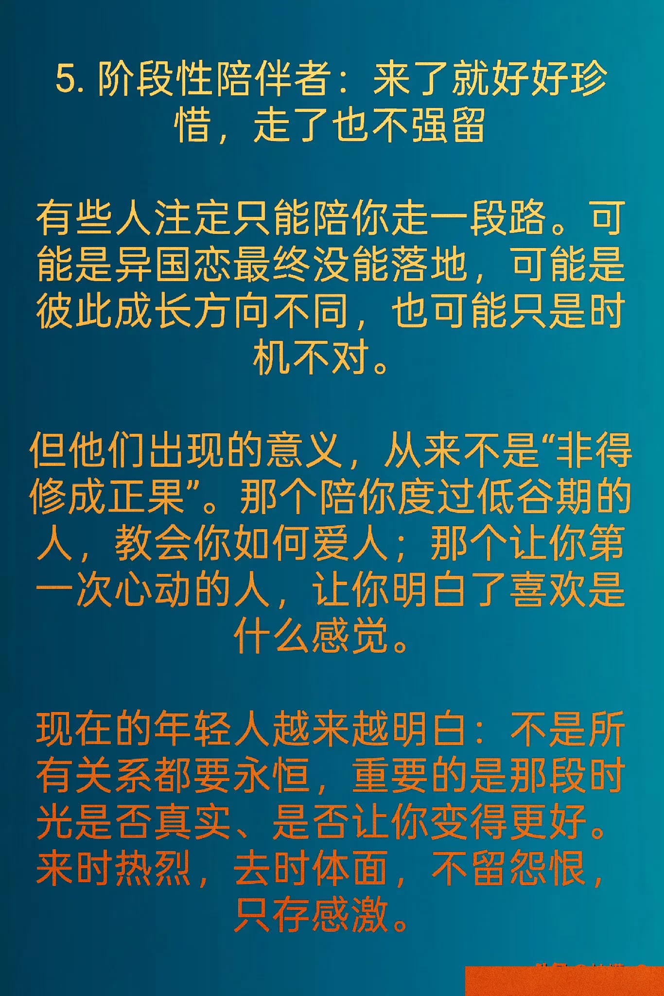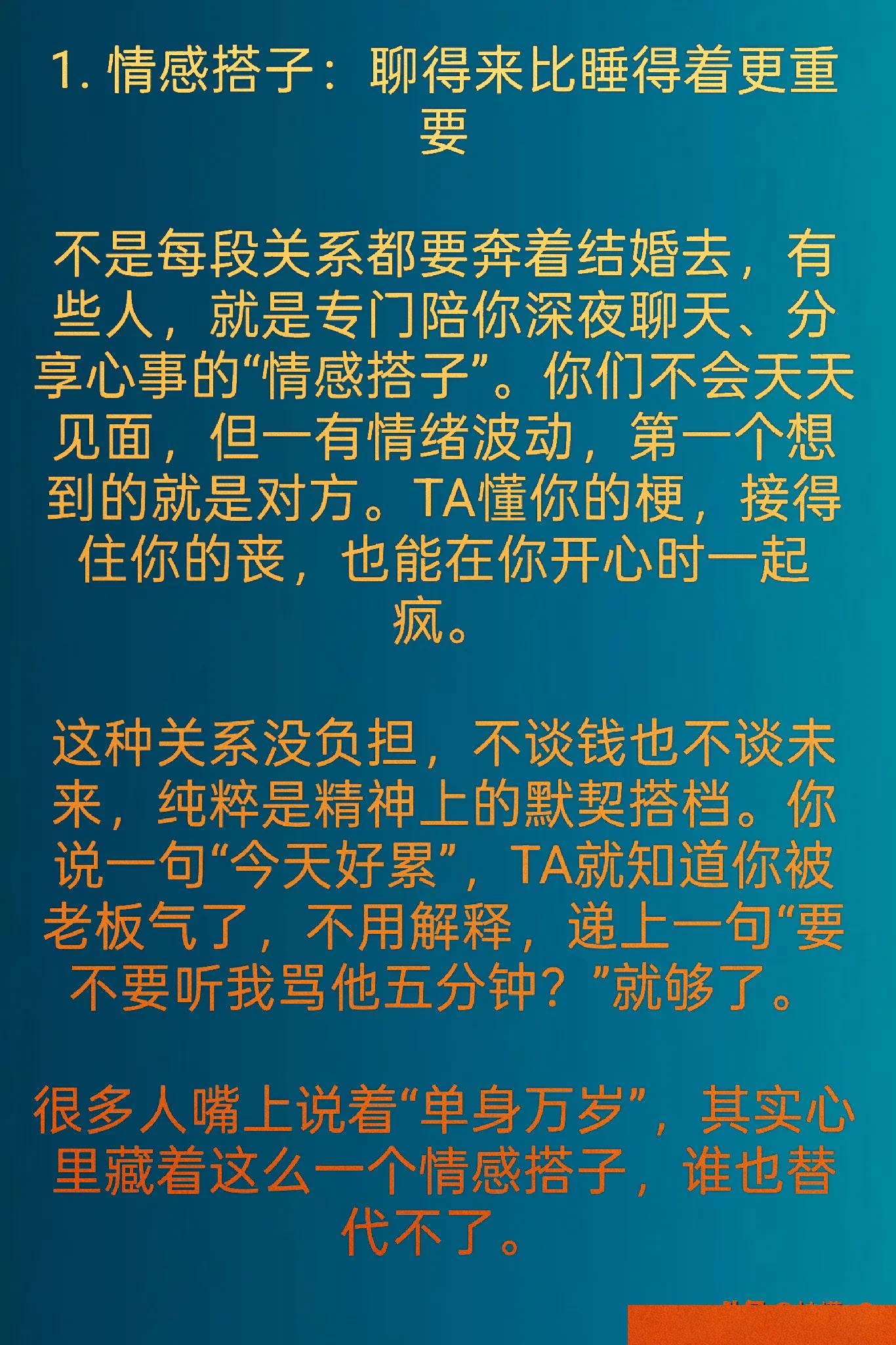 这个时代,感情的形式早已不再单一。你不需要非得“脱单”,也可以活得丰盛。你不必拥有传统意义上的“情人”,也能被温柔以待。这五种关系,没有高低对错,只有适不适合。你正在经历哪一种?或者,你心里藏着哪一个角色?有时候,最深的感情,未必挂在嘴边,而是藏在某个默契的眼神、一句“我懂”、一顿深夜的泡面里。生活很忙,真心很难得。只要有人让你觉得“人间值得”,那就是最好的关系。
