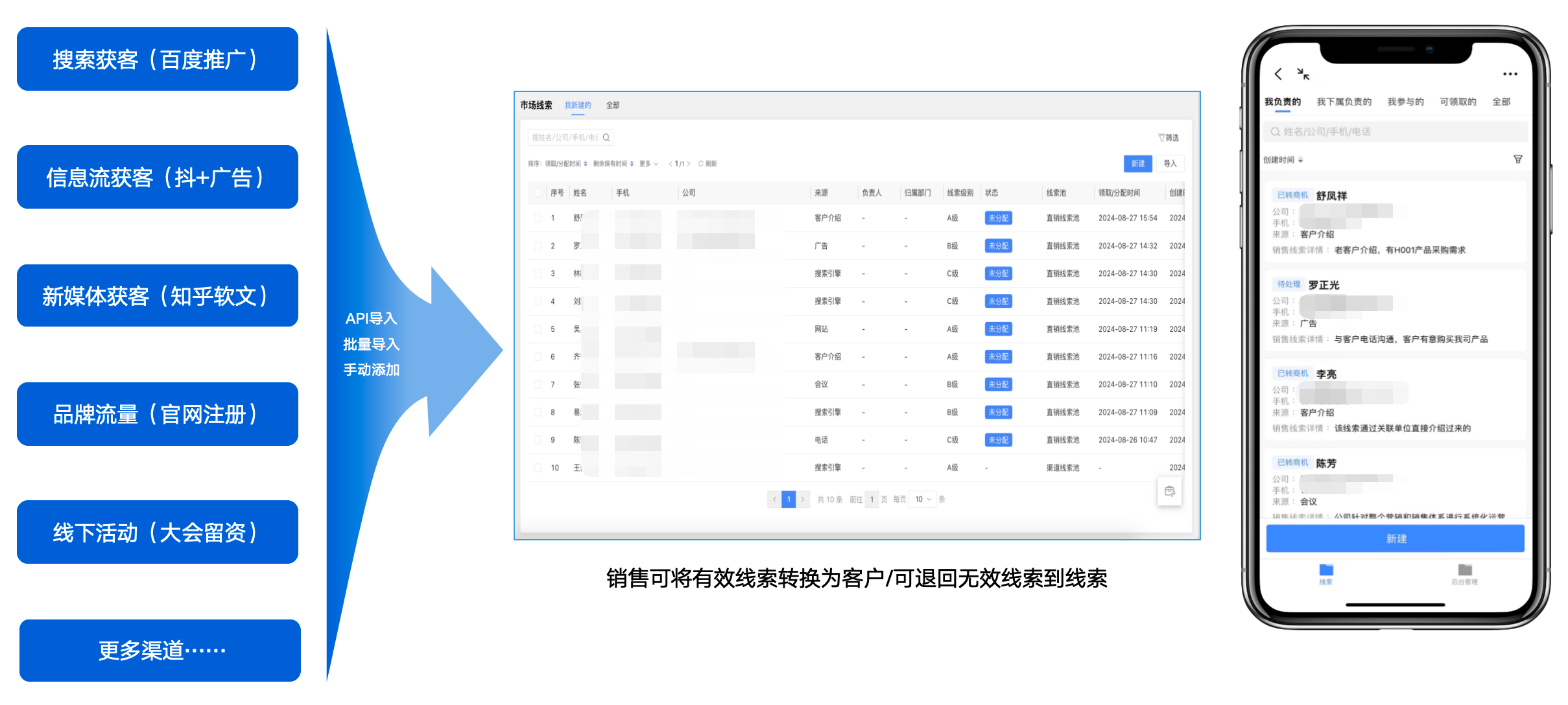 多渠道归集:整合搜索引擎、线下活动、伙伴推荐、官网咨询等线索来源,支持统一导入线索池,自动查重去重;