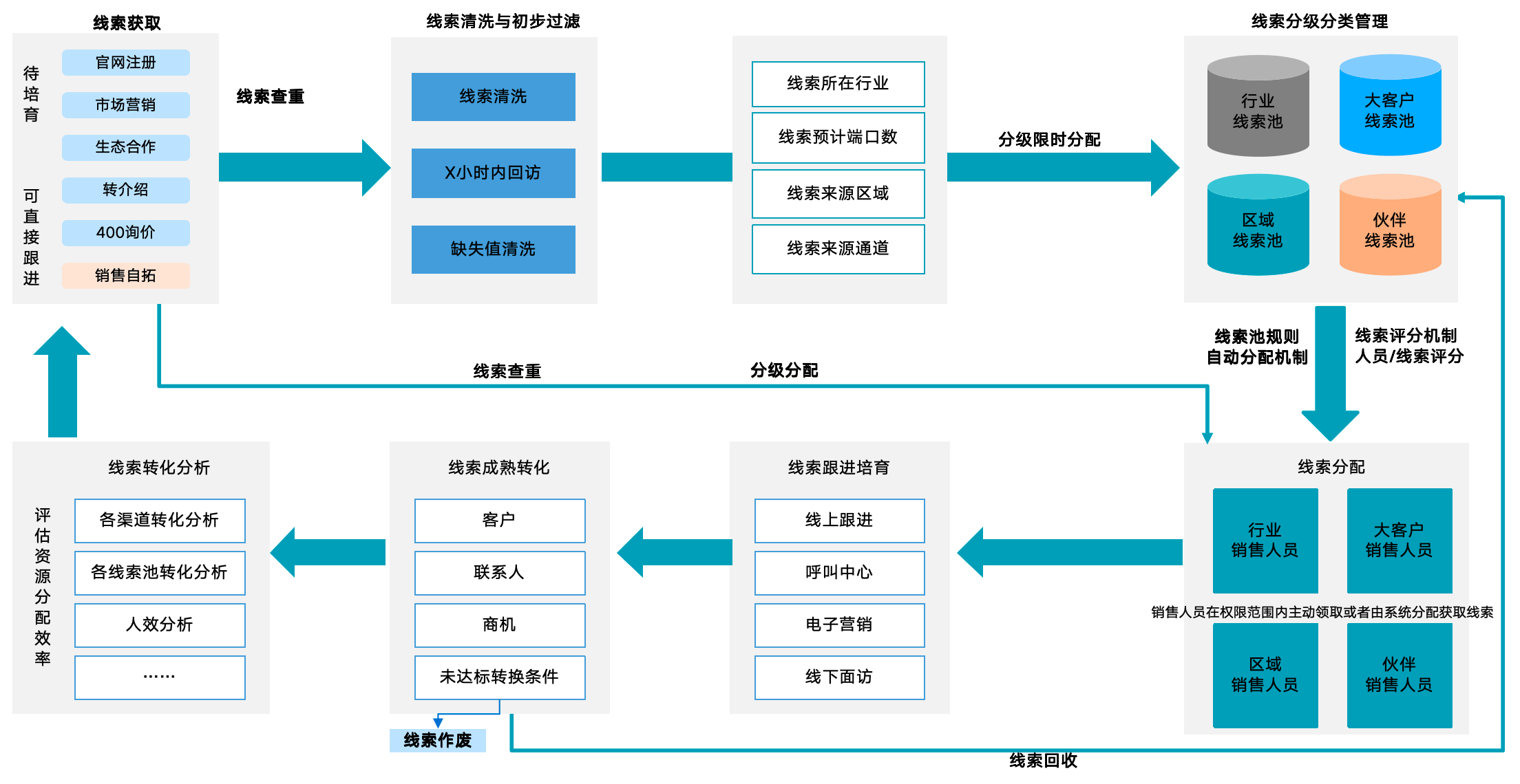 客户公海机制:未成交客户进入“公海池”,销售可主动领取或系统智能分配,老客户资源定期“重新评估-交叉分配”,避免资源闲置;