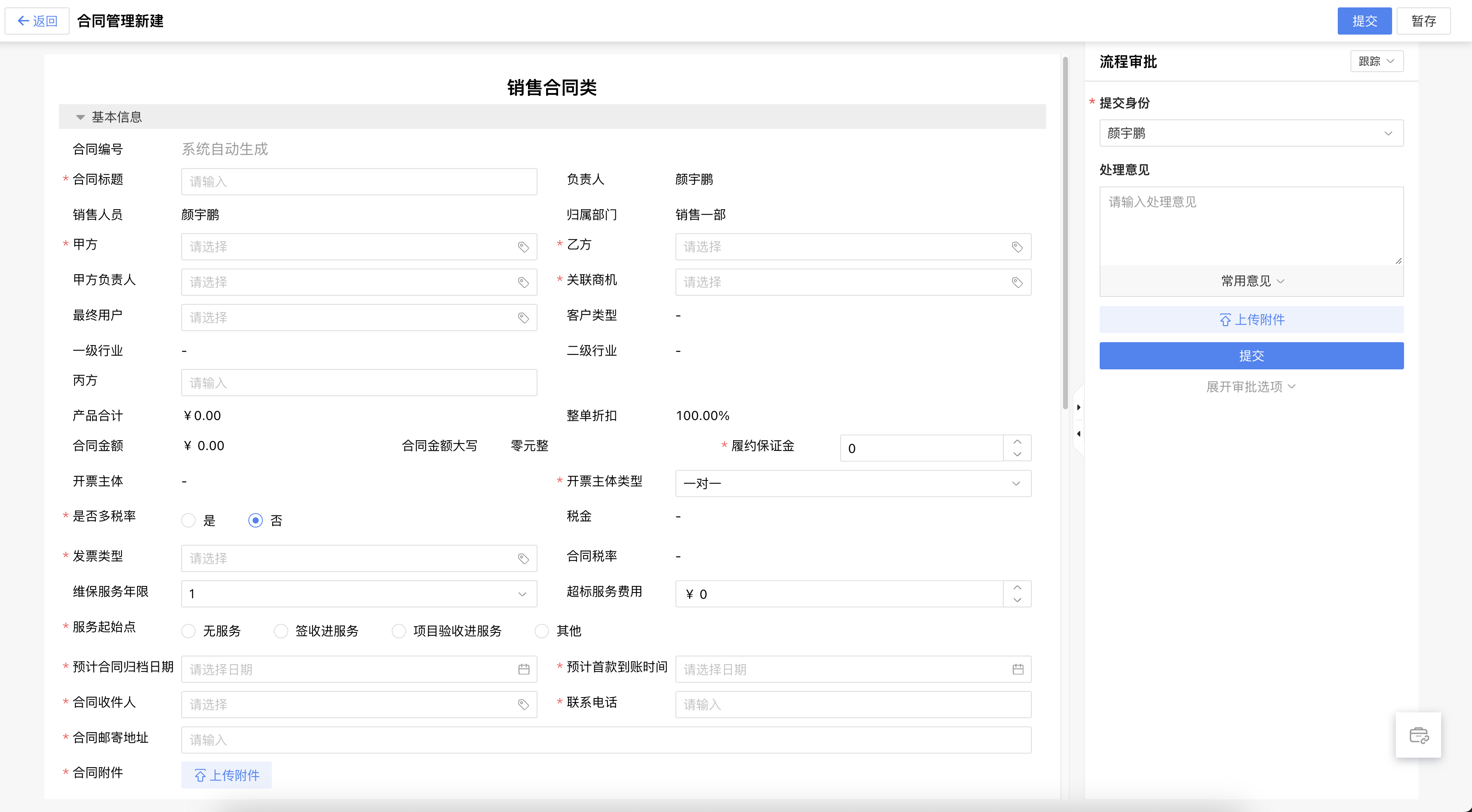 合同标准化:提供销售合同、框架协议等多类模板,支持电子签章、智能拟稿、智能审核等,合同审批在线流转,避免人工跑腿;