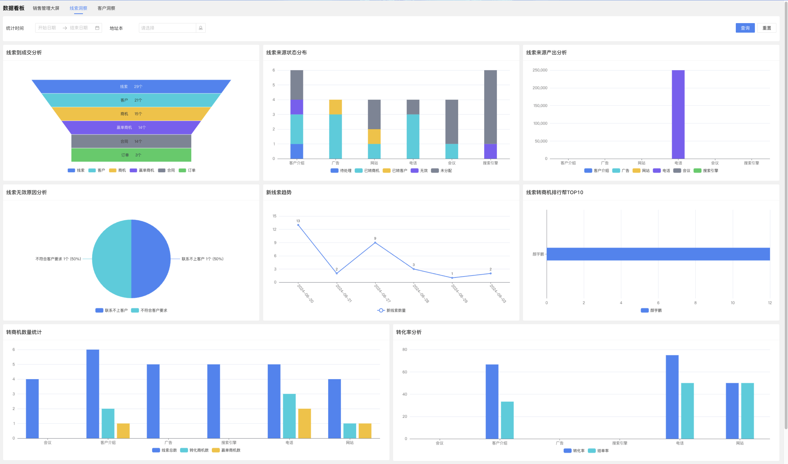 数据驱动优化:自动统计各渠道转化率、销售人员转化效率等数据,助力企业聚焦高产出营销渠道,并优化营销方向。