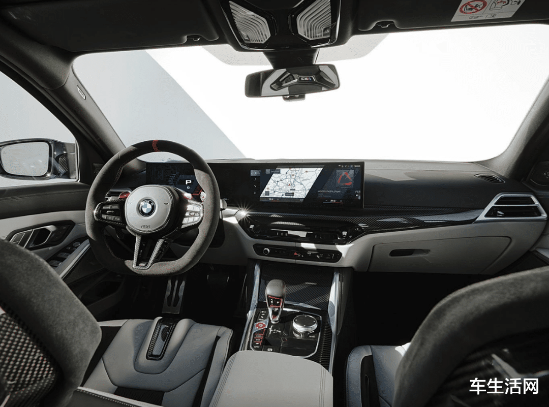 内部的座舱布局并没有太大的调整,以驾驶者为中心,12.3英寸全液晶仪表与14.9英寸中控屏组成曲面双联屏,搭载iDrive8.5系统,支持赛道数据显示与语音控制。大面积碳纤维与Alcantara材质包裹,M专属真皮方向盘带12点红色标识,可选装带发光Logo的碳纤桶形座椅,兼顾包裹性与舒适性。