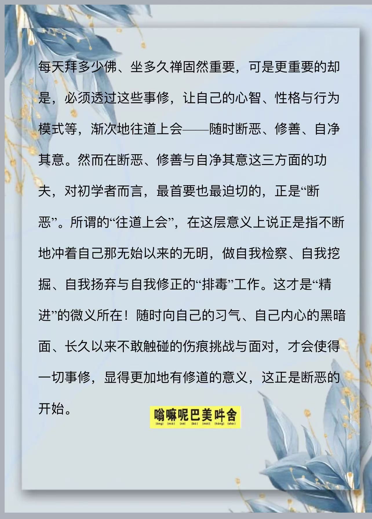 重要的是,必须透过这些事,让自己的心智、性格与行为模式等,渐次地往道上会--随时断恶、修善、自净其意。