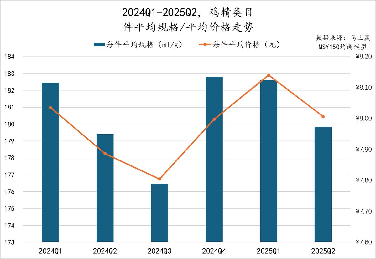 2024Q1至2025Q2,鸡精类目的件均规格和件均价格变化趋势基本同步,件均规格在2024Q4达到峰值,件均价格则在2025Q1达到峰值。