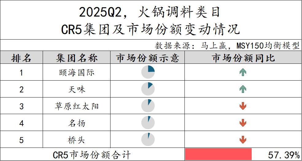 2025Q2,火锅调料类目CR5市场份额合计为57.39%。从市场份额同比变化来看,排名第一和第二的颐海国际、天味市场份额进一步提升,其后的草原红太阳、名扬、桥头则呈现市场份额同比下降。