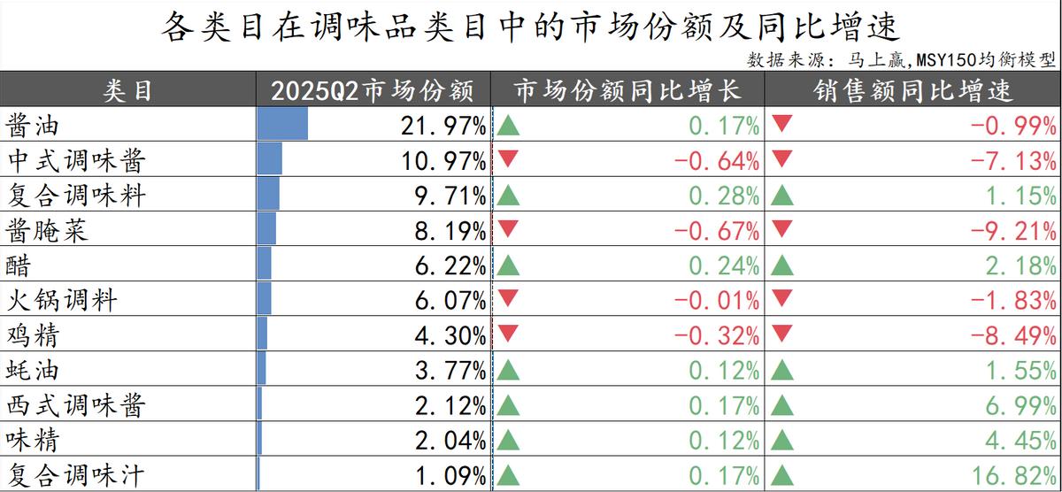 在本季度,我们选取了酱油、中式调味酱、复合调味料、酱腌菜、醋、火锅调料、鸡精、蚝油、西式调味酱、味精、复合调味汁共11个较有典型性与代表性的类目进行增速与类目内情况的观察,以2025Q2重点类目的市场份额计算,上述11个类目的市场份额合计>76%。