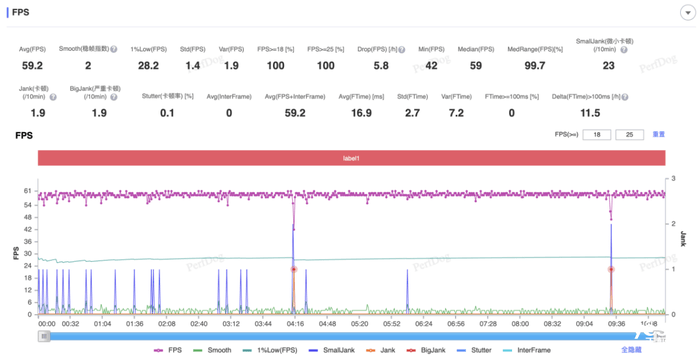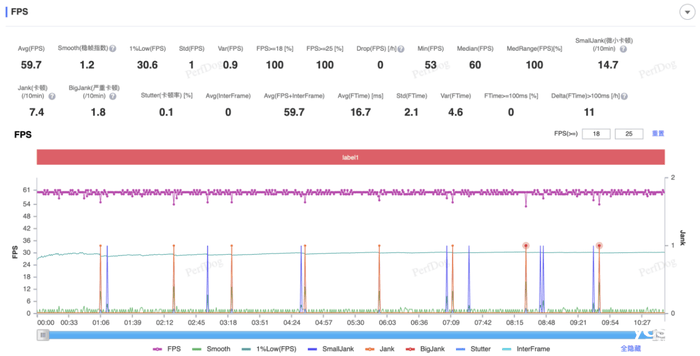 《原神》 画质设定为60帧、极高、关闭动态模糊与多人战斗,在层岩巨渊、须弥城、水天丛林、阿茹村、赤王陵跑图30分钟,平均帧数为59.7,平均功耗约为4.3W,可以看到每隔30秒会出现一次周期性帧率波动,帧数掉到30左右,这是由于《原神》新版本面对未上市新平台的常见bug,属正常现象。