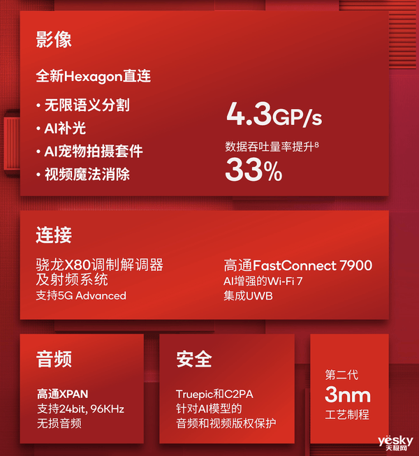 至于影像部分,骁龙8至尊版的Spectra ISP将支持无限实时语义分割、超暗光照片和视频拍摄、3.2亿像素照片拍摄等功能。连接方面则采用骁龙X80 5G调制解调器及射频系统,首次面向智能手机支持6Rx。同时采用高通FastConnect 7900移动连接系统,支持Wi-Fi 7并集成AI,实现40%以上功耗降低。