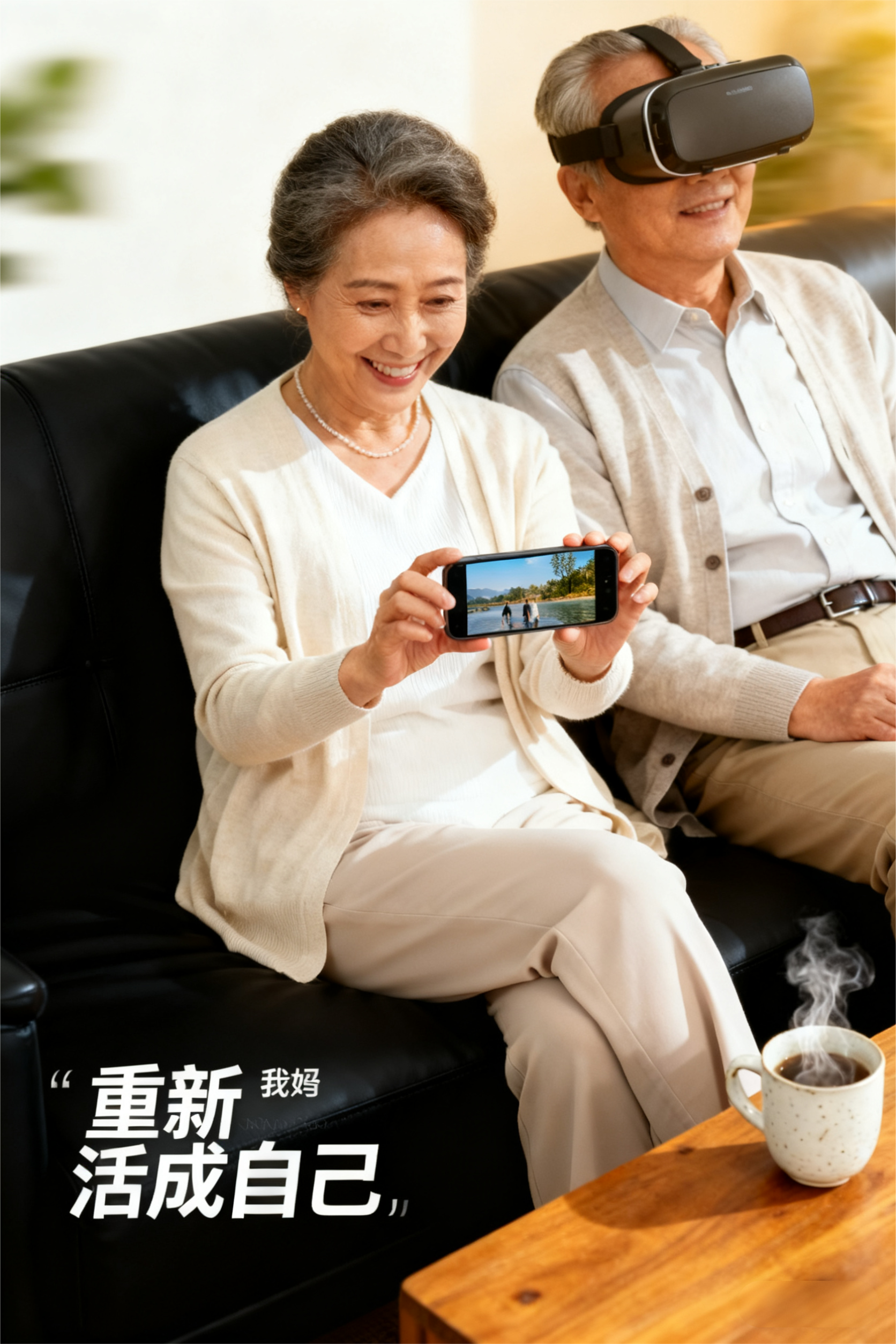 他的 T恤领口还沾着晚饭的菜汤,VR手柄攥得手心全是汗,嘴里念叨着“这玩意儿真神奇”,这才是我爸,永远对新鲜事儿好奇,又总有点“手忙脚乱”。