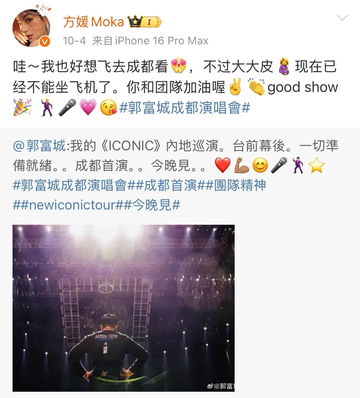 前段时间,港媒报道方媛已经诞下男宝,属于早产儿,但体重正常。不过方媛也有发文否认,在郭富城去成都开演唱会时发文为老公打气,称自己肚子大不能坐飞机。