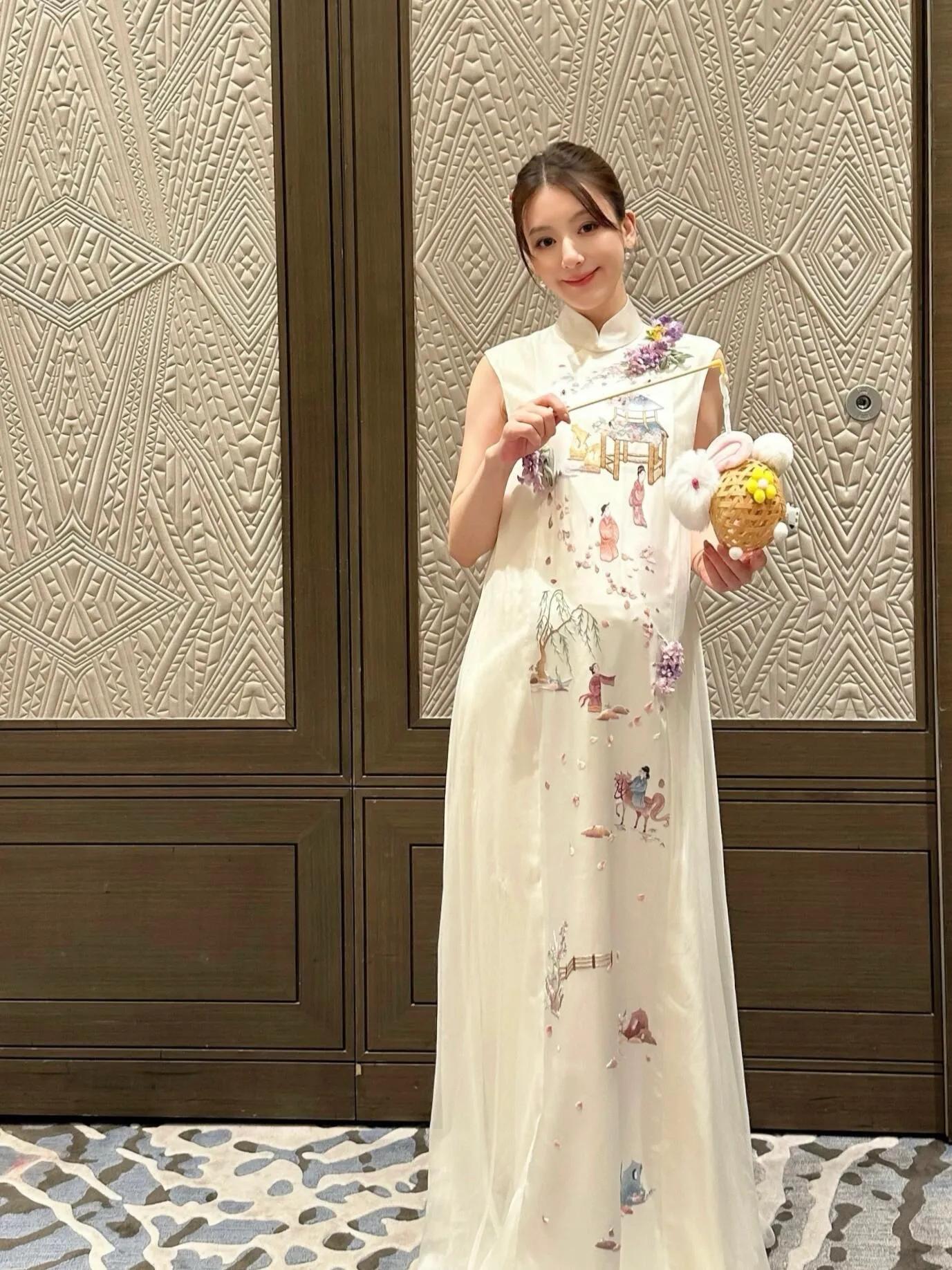俩女儿则穿着同款新中式旗袍,扎着丸子头,还戴着同款粉色花花,虽然俩姑娘都被贴纸遮住眼睛,但也能看出是漂亮小姑娘。