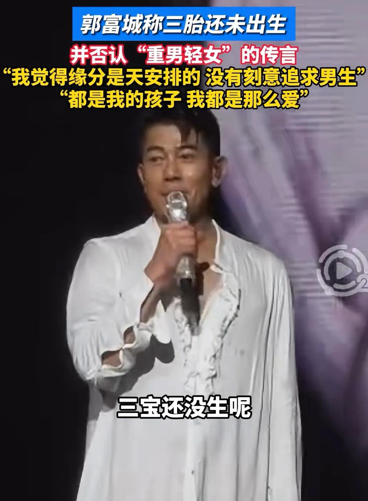而郭富城也在演唱会上透露“三宝还没生呢,我没有刻意去要生一个男生,我从来没有,我觉得都是我的孩子,我都是那么爱”。