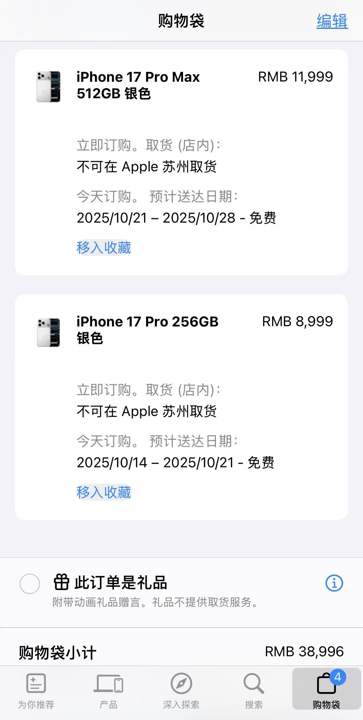 据郭静的互联网圈观察,反映iPhone 17系列火爆的另一个因素是:Apple Store上显示的取货日期。若9月19日购买,256GB版iPhone 17 Pro银色的预计送达日期最早是10月14日,而512GB版iPhone 17 Pro Max银色的雨季送达日期最早是10月21日,就连iPhone 17,最早送达日期也是10月21日,以往最不受欢迎的基础款系列,今年竟然同样火爆,这跟iPhone 17入门款变成256GB内存,并且采用A19芯片而不是老款iPhone 16 Pro/Pro Max同款处理器有很大关系。
