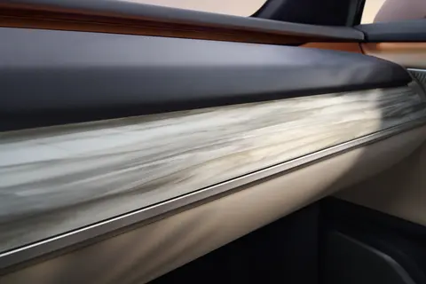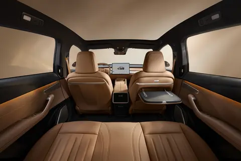 外观与内饰的升级侧重个性化与豪华感。新增“曙光金”车身颜色与“亮银”窗框配色,搭配20英寸“光影优雅亮银”轮圈,视觉质感显著提升——该车外观由前宾利设计师Raul Pires操刀,整体风格简约大气,新增配色更符合家庭用户对“耐看”与“质感”的追求。座舱内,新增“月榕棕”“云漫米”两种Nappa真皮座椅配色,搭配大理石纹饰板与真皮方向盘,豪华氛围进一步提升;此前需要选装的后排3档座椅通风改为标配,隐藏式ETC、全舱屏幕防蓝光功能等细节配置,也更贴合家庭用户的日常使用场景。尤为实用的是后排右侧折叠小桌板,孩子乘车时可用于写作业、吃零食,解决了家庭出行中的小痛点。