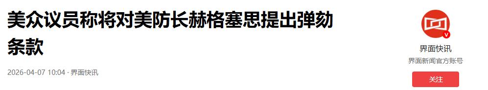 当地时间4月6日,美国国会众议员安萨里宣布,她将提交针对美防长赫格塞思的弹劾条款,理由是他“屡次违反就职誓言和对宪法的职责”,具体表现为“鲁莽地危害美国军人的生命安全,并屡次犯下战争罪行”。