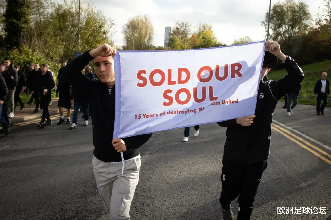 这里小欧解释下,“出卖了我们的灵魂”这句话,是西汉姆球迷抗议的常用口号,算是一种传统了。