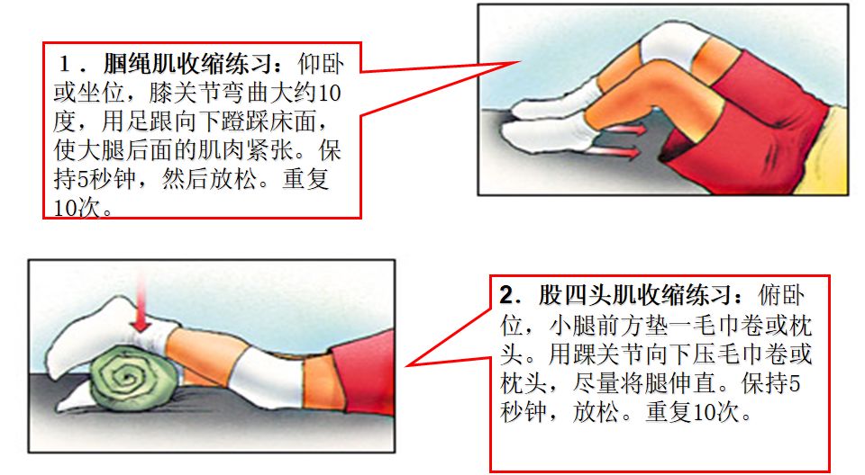 方法:①活动髌骨;②直腿抬高;③屈膝锻炼(足部不离开床面);④踝关节主动屈伸锻炼;⑤伤口定期换药。