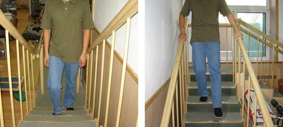 上下楼梯:上台阶时健腿先上,足底登稳,膝关节绷直后患腿迈上。下台阶时患腿先下,足跟登稳,膝关节绷直后健腿迈下。每组10次,直到步态正常,活动自如止。