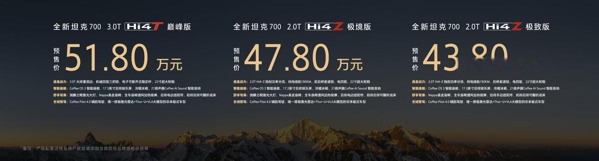 3月30日,在坦克品牌“新时代·新旗舰——人生自此新境”发布会上,全新坦克700正式开启预售。新车推出3.0T Hi4-T、2.0T Hi4-Z两大动力版本共3款车型,官方预售价43.80万-51.80万元。作为坦克品牌向上的重磅战略车型,全新坦克700定位“全域豪华SUV新旗舰”,以中华传统文化及智慧为根,以长城汽车全栈自研核心技术为底,满足从商务通勤、家庭出行到长途穿越,以及极限越野的全场景需求,开创全域豪华SUV新品类,为全球用户带来全场景无短板的豪华出行新体验。