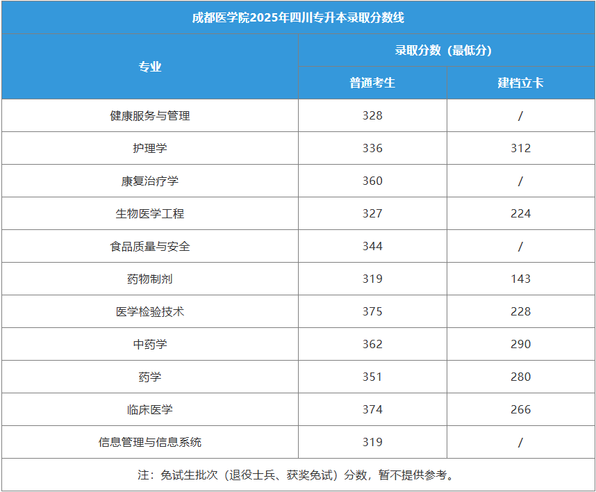 2025 年成都医学院专升本中,医学检验技术(375 分,招 9 人)、临床医学(374 分,招 10 人)是普通考生分数最高的专业;药物制剂、信息管理与信息系统普通批次最低分均为 319 分,分别招 13 人、1 人,其中药物制剂建档立卡批次仅 143 分(招 10 人),是该类批次分数最低的专业;护理学普通批次 336 分,建档立卡批次 312 分,分数差距相对较小。