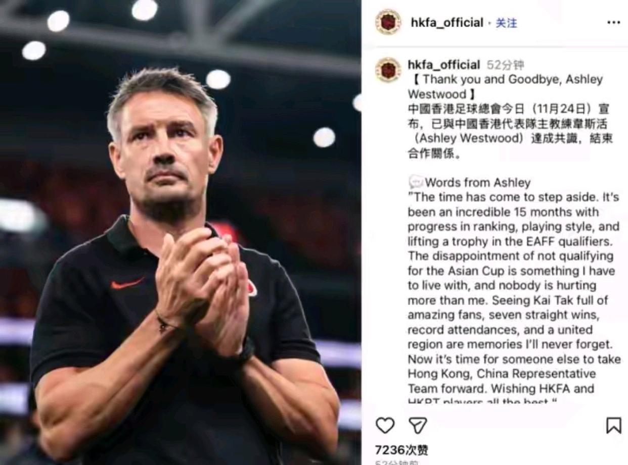中国香港足球总会于11月24日正式宣布,解除主教练阿什利·韦斯特伍德的职务。这一决定距离球队在亚洲杯预选赛中的关键失利仅过去数日,标志着香港队一个时代的终结与新一轮重建的开始。