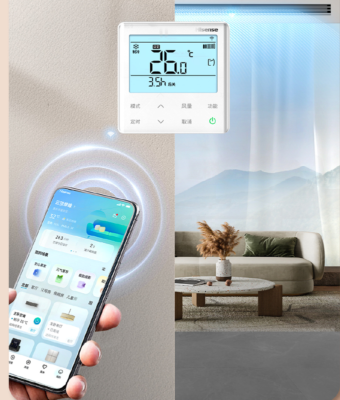 海信中央空调新风室内机的设计,正是为了让每个家庭成员都能轻松享受健康空气。它的一键新风功能简单易用,即使是老人和孩子也能快速上手。更贴心的是,它的新风系统会智能匹配空调送风,既不会让冷风直吹让人不适,又能高效替换室内污浊空气。前一秒还弥漫着饭菜味和闷热感的客厅,转眼间就变得如森林般清爽自然。