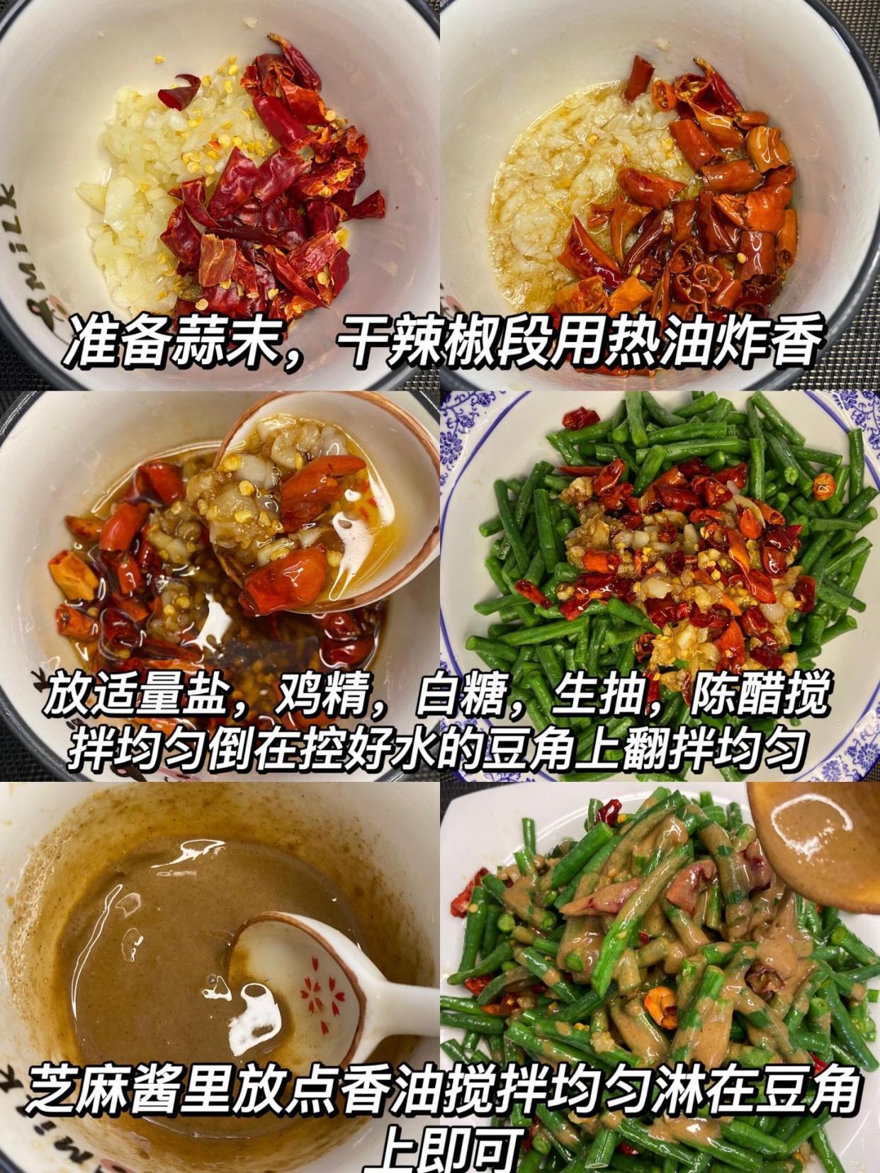 准备蒜末、干辣椒段,用热油炸香,再加入适量盐、鸡精、白糖、生抽、陈醋搅拌均匀,倒在控好水的豆角上翻拌均匀;