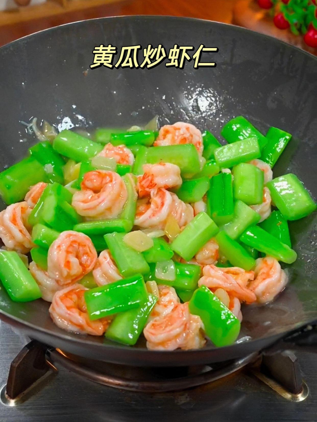 锅中油热后放入姜蒜末爆香,倒入黄瓜块翻炒至断生,再倒入焯好的虾仁;