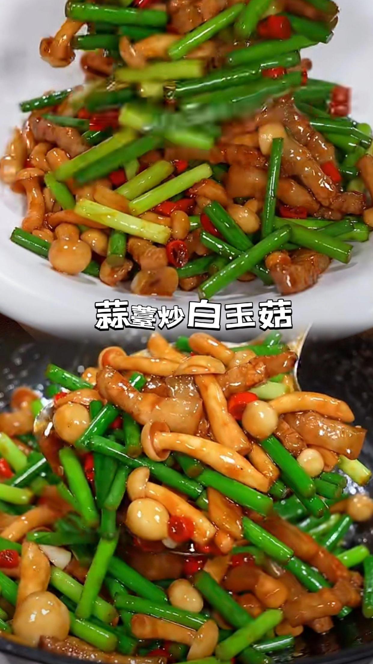 放入蒜薹段和白玉菇段,加入适量盐、生抽和鸡粉;