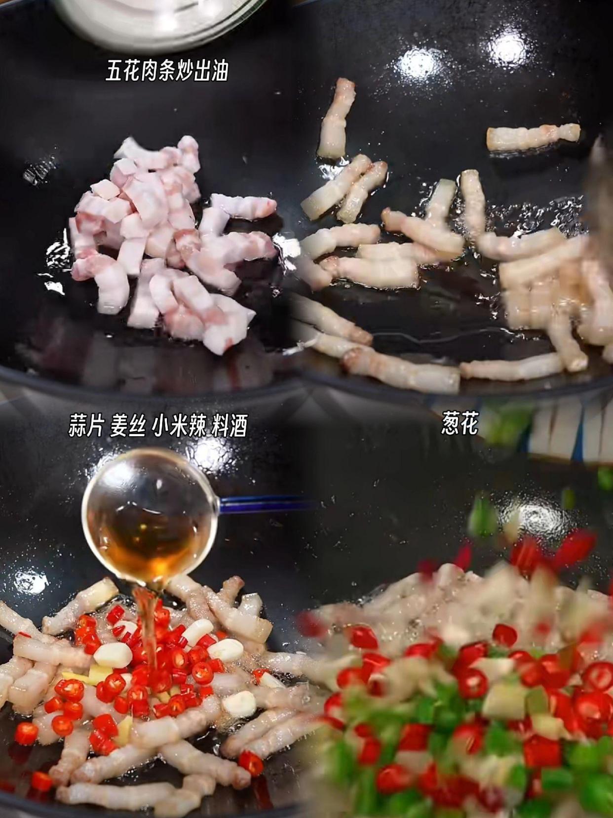 加入葱花、蒜片、姜丝、小米辣和料酒,翻炒出香味;