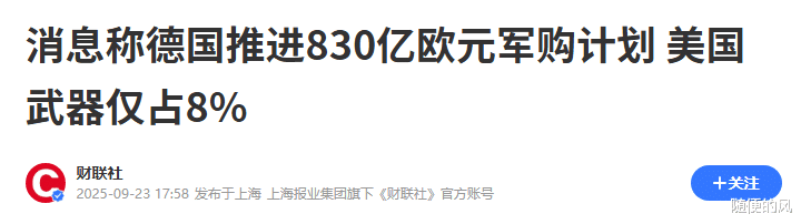 你可能只看到了德国准备砸下830亿欧元搞军购的数字,觉得这不过是地缘政治紧张下的常规操作,但真正的杀招,藏在一个冰冷至极的百分比里:美国武器,只占了区区8%。