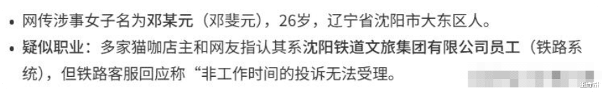由于事件在网上愈演愈烈,神通广大的网友,很快把虐猫女身份扒了出来,原来是在沈阳铁路文旅工作。
