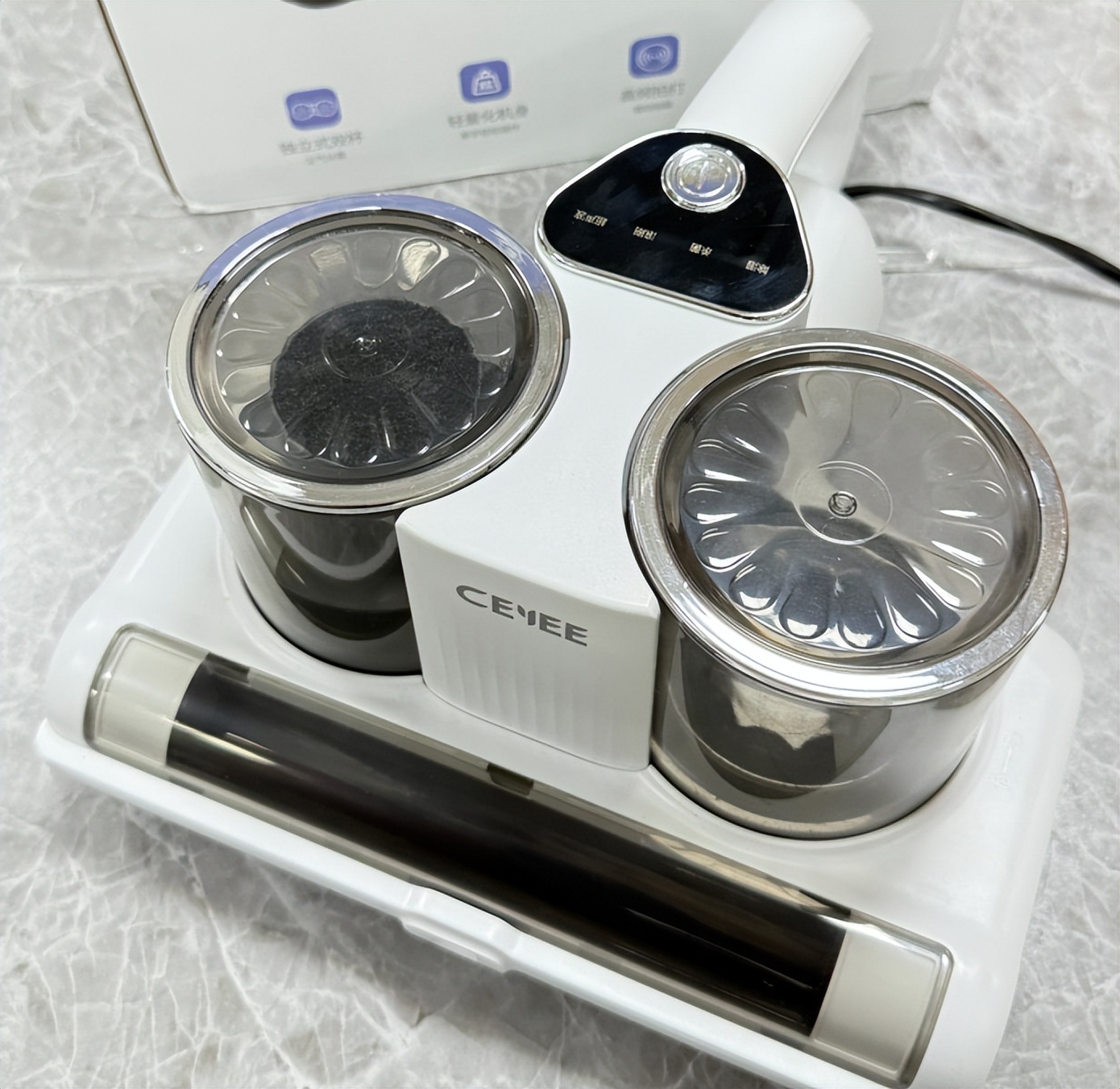 清洁性能描述:核心优势为专利双杯电击设计,实测配合48000次/分钟滚刷拍打,能震出床垫3-5cm深处螨虫并物理灭活。紫外线+超声波+电击三重防护,螨虫检测试纸显示处理后活螨数量大幅减少。LED数显实时提示尘螨浓度,重灾区红灯预警,避免盲吸。