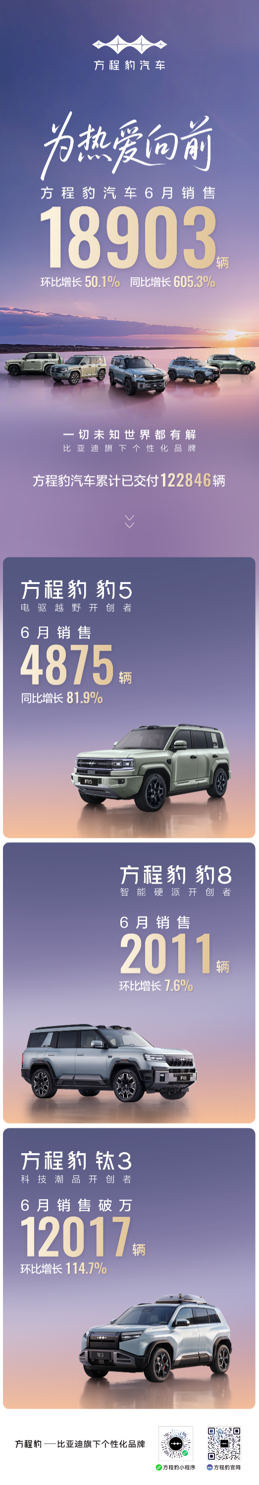 方程豹品牌的销量腾飞,是市场对其“产品+品牌”双核驱动的深度认可。从重塑硬派越野标准的豹5,到颠覆主流纯电SUV市场的现象级产品钛3,方程豹以差异化的产品矩阵精准覆盖多元用户需求,实现个性版图的持续扩张,以及品牌价值的不断跃升。